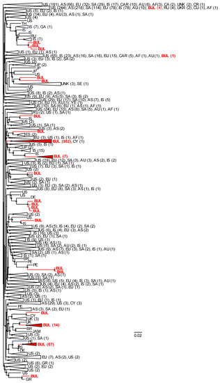 Maximum-likelihood (ML) phylogeny of global HIV-1 subtype B sequences. The ML tree was constructed with FastTree v2.1.10 using 663 sequences from Bulgaria and 1933 global sequences. Confidence values of clusters were assessed by using the Shimodaira–Hasegawa (SH) test in FastTree. SH values > 0.7 are shown at nodes with an asterisk. Large clades are collapsed, and the corresponding country or continent are provided with codes followed by total numbers of sequences in parentheses. AF, Africa; AS, Asia; AU, Australia; BR, Brazil; BUL, Bulgaria (in red text); CA, Canada; CAR, Caribbean; CR, Costa Rica; CU, Cuba; CY, Cyprus; DE, Germany; ES, Spain; EU Europe; GA, Georgia; GR, Greece; IS, Israel; JAM, Jamaica; JP, Japan; PE, Peru; SA, South America; SE, Sweden; RU, Russia; TH, Thailand; UKR, Ukraine; UK, United Kingdom; UNK, unknown; US, United States; YE, Yemen.