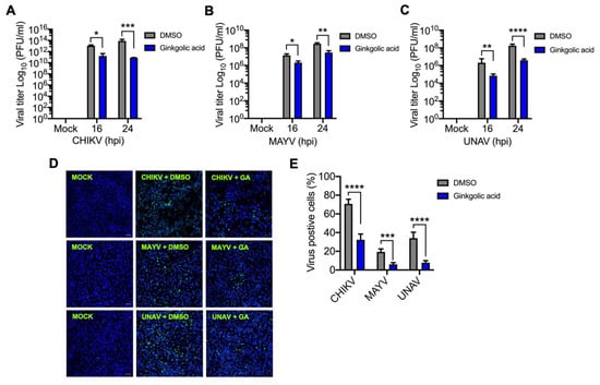 Ginkgolic acid impairs Alphavirus progeny production. Vero (A) and HeLa (B,C) cells were pre-treated with Ginkgolic acid at 10 µM or 0.1% DMSO as a control for 1 h. Then, the medium with the treatment was removed and the cells were infected with CHIKV, MAYV or UNAV at an MOI of 10. After 1 h of virus absorption, fresh medium was added with Ginkgolic acid or DMSO and the cells were incubated for 16 or 24 h post-infection (hpi). Viral progeny yield in cell supernatants collected at indicated times were quantified by plaque-forming assay. Viral titers were represented as plaque-forming units per milliliter (PFU/mL). Statistically significant differences were assessed with the Two-way ANOVA test: * p < 0.05; ** p < 0.01; *** p < 0.001 and **** p < 0.0001. (D,E) Vero or Hela cells grown on glass cover slips were pre-treated with Ginkgolic acid or DMSO and then infected with the Alphavirus at an MOI of 1. After 24 h of incubation with the treatment, cells were fixed and stained with anti-CHIKV, anti-MAYV or anti-UNAV mouse primary antibodies, followed by an Alexa-Flour 488 mouse secondary antibody. Cell nuclei were stained with Dapi (in blue). Images were obtained with a confocal microscope and analyzed with ImageJ software. The percentage of viral antigen-positive cells was evaluated in at least 10 fields for each experimental condition. These data were analyzed with the Two-way ANOVA test. Statistically significant differences are shown: *** p < 0.001 and **** p < 0.0001. Scale bar, 50 µm.