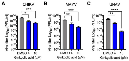 3.2. Alphavirus Titer Decrease Is Ginkgolic Acid Concentration-Dependent