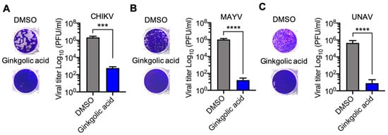In order to analyze if Ginkgolic acid has a direct effect on the infectivity of Alphavirus particles, we incubated 106 PFU of CHIKV, MAYV or UNAV in serum-free medium with the Ginkgolic acid or DMSO at 37 °C for 1 h. Subsequently, the remaining virus in each experimental condition was quantified as previously indicated. As shown in Figure 3, Ginkgolic acid had a strong effect on viral infectivity; we found significant decreases of 4 to 5 logs in viral titers. These results suggest that Ginkgolic acid impairs the infectivity of Alphavirus particles.