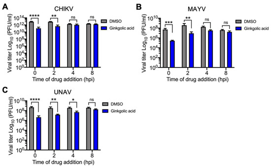 Ginkgolic acid prevents Alphavirus replication at an early stage of the viral cycle. Vero (A) or HeLa (B,C) cells were infected with CHIKV, MAYV, or UNAV and after 1 h of virus absorption, Ginkgolic acid or DMSO were applied to the cells at the indicated times. Then, the viral progeny production was measured in the cell supernatants after 24 h of incubation with the Ginkgolic acid or DMSO as previously indicated. The viral titers were expressed as plaque-forming units per milliliter (PFU/mL). Data were analyzed with the Two-way ANOVA test. Statistically significant differences are shown: * p < 0.05; ** p < 0.01; *** p < 0.001; **** p < 0.0001; ns: non-significant.