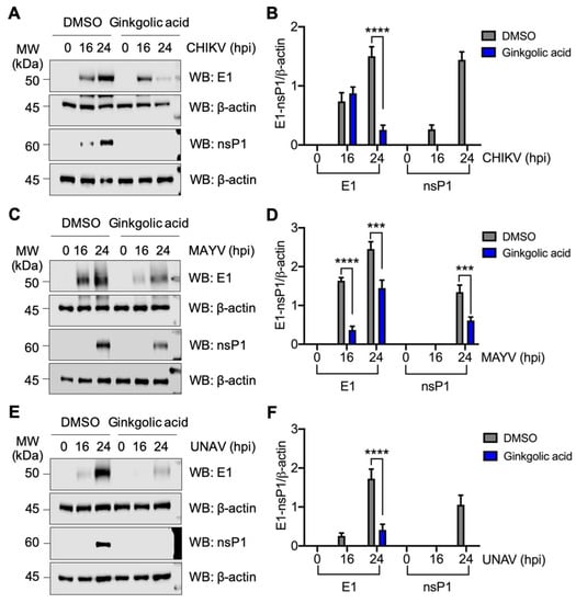 The previous results suggest that Ginkgolic acid could also have a negative effect on a post-entry step in the Alphavirus cycle. With respect to this, we wanted to explore other possible mechanisms by which Ginkgolic acid inhibits Alphavirus replication. Thus, we assessed the expression of viral proteins structural E1 and non-structural nsP1 in cell lysates obtained from cells infected with CHIKV, MAYV, or UNAV and treated with Ginkgolic acid or DMSO at different times. As shown in Figure 5A,C,E, we detected strong expression of both E1 and nsP1 proteins in DMSO-treated cells at 24 hpi for all evaluated alphaviruses. Conversely, Ginkgolic acid treatment resulted in a notable suppression of viral protein expression (Figure 5A,C,E). Furthermore, a semi-quantitative densitometric analysis for both viral proteins confirmed these findings (Figure 5B,D,F). Collectively, these results indicate that Ginkgolic acid affects the expression of Alphavirus proteins.