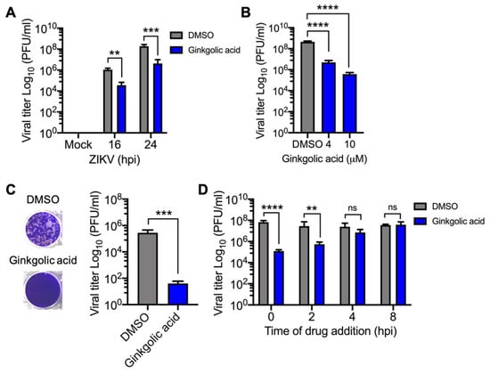 Ginkgolic acid also inhibits Zika virus (ZIKV) replication. (A) Vero cells were pre-treated with 10 µM Ginkgolic acid or 0.1% DMSO. After 1 h of incubation, the treatment medium was removed and the cells were infected with ZIKV at a multiplicity of infection (MOI) of 10. Then, fresh medium with Ginkgolic acid or DMSO was added to the cells and they were incubated for 16 or 24 hpi. Viral progeny production in the cell supernatants was measured as previously mentioned. (B) Vero cells were pre-treated with increasing concentrations of Ginkgolic acid and then infected with ZIKV as above. Viral titers in cell supernatants were quantified as previously described. (C) Nearly 105 PFU of ZIKV were incubated in serum-free medium with Ginkgolic acid or DMSO as described previously. The remaining virus in both experimental conditions was titrated using plaque-forming assay. (D) Vero cells were infected with ZIKV; after 1 h of virus absorption, Ginkgolic acid was added to the cells at the indicated times. Viral production was evaluated as previously described. Viral titers were expressed as plaque-forming units per milliliter (PFU/mL). Data were analyzed with the One- or Two-way ANOVA test and Mann & Whitney test. Statistically significant differences are shown: ** p < 0.01; *** p < 0.001; **** p < 0.0001; ns: non-significant. .