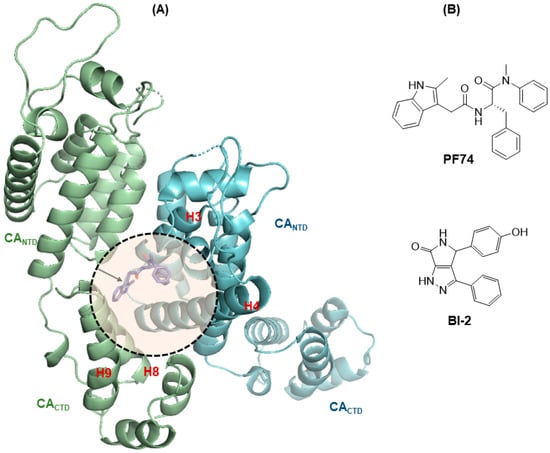 Structure of HIV-1 capsid protein (CA) and a key CA ligand binding pocket. (A) The structure of CA dimer (Protein Data Bank code: 4XFZ []). The pocket formed around H3 and H4 of the CANTD (cyan), and H8 and H9 of the adjacent CACTD (green) accommodates the binding of multiple ligands, including host factors Nup153 and CPSF6, and small molecules PF74 and BI-2. Shown in the pocket is PF74 (pointed to with an arrow); (B) chemical structures of PF74 and BI-2.