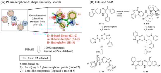 Despite the attractive antiviral profile and the unique bimodal mechanism of action, PF74 is not a viable drug candidate due primarily to its prohibitively poor metabolic stability []. In human liver microsomes (HLMs), the half-life (t1/2) of PF74 was less than 1 min [,]. This major deficiency strongly necessitates targeted efforts to search for structurally novel and metabolically stable small molecules capable of binding to the PF74 binding pocket. Along this line, the Zhan and Liu group recently reported PF74-like compounds where an easier and synthetically more accessible 1,2,3-triazole ring was substituted for the indole moiety [,]. However, such compounds were considerably (>10-fold) less potent than PF74 in antiviral assays and were essentially as unstable in HLMs [,]. Our current work features a pharmacophore-based shape similarity search approach based on PF74 (Figure 2A). Molecular similarity [,] is an important concept in medicinal chemistry and drug discovery. Hit generation using similarity search is based on the premise that similar chemical structure confers similar biological activity. In our search, we extracted the 3D conformation of PF74 from reported co-crystal structure (PDB: 4XFZ []) and defined 7 pharmacophore points (Figure 2A) according to its mode of binding, including two H-bond donors (D1 and D2), two H-bond acceptors (A1 and A2), as well as three hydrophobic moieties (H1, H2 and H3). This 3D pharmacophore was then used to screen against a subset of the ZINC database [] (100K compounds) using the program PHASE [,]. Hit ranking was based on the number of pharmacophore points satisfied and the lead like properties as predicted by the Lipinski’s rule of 5 []. From this similarity search we selected two hits (2 and 22) for analog synthesis and SAR (Figure 2B). Molecular hybridization [] between hit 2 and PF74 also generated hit 11, which was also subjected to analog synthesis (Figure 2B). We report herein the analog synthesis and SAR on all three hits. In the end, our best compound inhibited HIV-1 with an EC50 of 1.6 μM, and more important exhibited a half-life (t1/2) 44-fold longer than PF74.