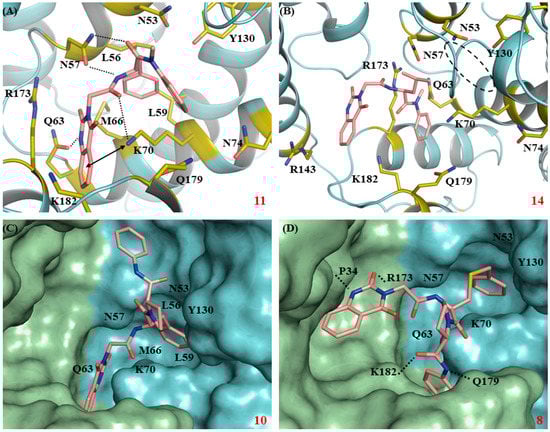 To understand some of the aforementioned SAR, we performed molecular modeling with selected compounds based on the co-crystal structure of native HIV-1 capsid protein bound to PF74 (PDB code: 4XFZ []). Compound 11 (Figure 3A) bearing a quinazoline-2,4(1H,3H)-dione core in place of the indole ring of PF74 interacted with the same key residues in the CA hexamer as PF74. Observed key interactions included (i) hydrogen-bonding between N57 and the NH and carbonyl groups of the phenylalanine fragment on compound 11, between K70 and the carbonyl next to the phenylalanine fragment of 11, and between Q63 and the free NH of the quinazoline-2,4(1H,3H)-dione core of 11; (ii) cation-π interactions between protonated K70 and quinazoline-2,4(1H,3H)-dione aromatic ring. However, despite sharing the same binding site and similar key interactions, compound 11 was significantly less potent than PF74. In the meantime, a complete loss in potency was observed for leucine derived analog 14, which could be attributed to its shifting away from the binding site (circled), possibly in a binding mode shown in Figure 3B, and hence the loss of key interactions. This observation signified the importance of the phenylalanine core of these compounds for potency. In particular, the benzyl group of the phenylalanine core could play an important role in keeping a molecule inside the PF74-bound cavity through hydrophobic interactions [] with surrounding residues L56, M66, and L69, as evident from the observed binding mode for compound 11 (Figure 3A). This was consistent with the significant increase in the potency of compound 10 as well, which bears a benzyl group and an additional L-proline core. Like the PF74 backbone, the benzyl group of the phenylalanine fragment forces compound 10 to nestle in the cavity in such a way that the aniline ring of the L-proline core is extended to the adjacent CANTD domain, resulting in an additional hydrogen-bonding between the carbonyl of the L-proline and NH2 of N53, along with the typical H-bonding with N57, Q63, and K70 (Figure 3C). Additionally, pyrrolidine core of L-proline is oriented in such a way that it has maximum interaction with A105, T107, and Y130. Expectedly, introduction of an L-cysteine derived core having an elongated backbone in place of phenylalanine in compound 8 forces the entire molecule out of the cavity, diminishing it potency (Figure 3D). Compound 8 was found to be closer to the adjacent CACTD and CANTD domains, interacting with P34, R173, Q179, and K182 through H-bonding.
