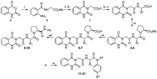 Synthetic Strategy for Analogs 2–21. Reagents and conditions: (i) glycine methyl ester hydrochloride, Et3N, DMF, rt, 12 h; (ii) ethyl chloroformate, pyridine, rt, 12 h; (iii) NaOH, MeOH/H2O, 60 °C, 12 h; (iv) L-amino acid methyl ester hydrochloride, HATU, DIPEA, DMF, rt, 12 h; (v) LiOH, MeOH/H2O, rt, 12 h; (vi) L-proline methyl ester hydrochloride, PyAOP, DIPEA, DMF, rt, 12 h; (vii) LiOH, MeOH/H2O, rt, 12 h/60 °C, 3 h; (viii) amine, PyAOP, DIPEA, DMF, rt, 12 h; (ix) amine, HATU, DIPEA, DMF, rt, 12 h.