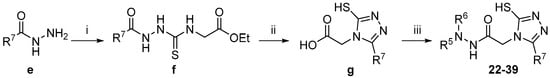 Synthetic Strategy for Analogs 22–39. Reagents and conditions: (i) ethyl isothiocyanatoacetate, ACN, 40 °C, 3 h; (ii) NaOH, H2O, 100 °C, 3 h; (iii) Hydrazine, HATU, DIPEA, DMF, rt, 24 h.
