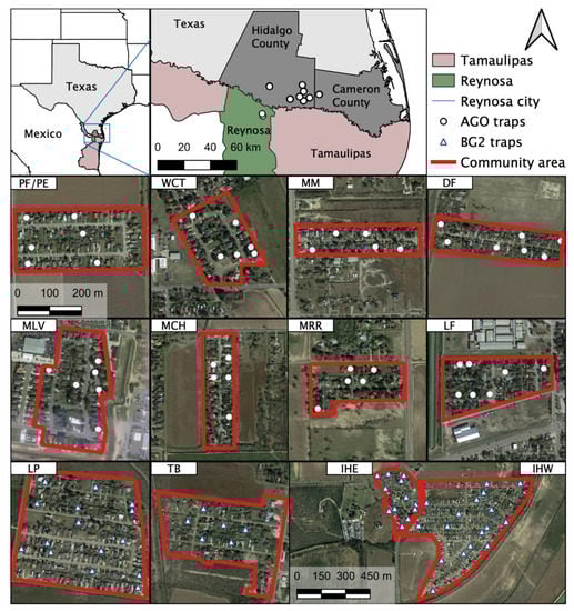 Study sites and location of traps in the Lower Rio Grande Valley (LRGV), South Texas and Reynosa (municipality), Tamaulipas. The 12 study locations in the LRGV are included as individual maps: PF/PE = Progreso Fresno/Progreso Encino; WCT = Weslaco, Christian Court; MM = Mercedes, Mesquite; DF = Donna, Figueroa; MLV = McAllen, La Vista; MCH = Mercedes, Chapa; MRR = Mercedes, Rio Rico; LF = La Feria; LP = La Piñata; TB = Tierra Bella; IHE = Indian Hills East; IHW = Indian Hills West.