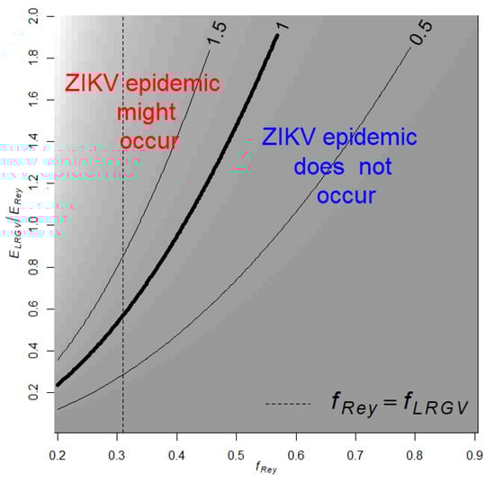 where 0.8 is the ratio between mosquito abundance in LRGV and Reynosa estimated with AGO traps, and 0.31 is the proportion of Ae. aegypti feeding on humans in LRGV. is the proportion of Ae. aegypti feeding on human in Reynosa, and is the risk of human exposure to Ae. aegypti bites in Reynosa (LRGV). Then, with the estimate and using different combinations for the unknown parameters, fRey and ERey/ELRGV, of Equation (4) we studied the conditions for the establishment, i.e., R0 > 1, of a ZIKV epidemic in the LRGV (Figure 2). Our analysis shows that if fRey = fLRGV then ZIKV outbreaks would not occur in the LRGV when the risk of human exposure to Ae. aegypti bites in the LRGV is below 60% of the risk in Reynosa (Figure 2). Below 60%, there are limited scenarios where Zika outbreaks may occur in the LRGV: for example, when the fRey is smaller than fLRGV and the human exposure risk to Ae. aegypti bites in Reynosa is fives time larger than in LRGV (Figure 2).