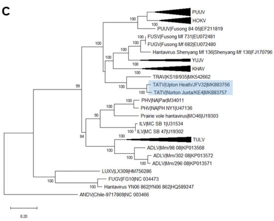 Phylogenetic relationship of Tatenale virus with other vole-associated orthohantavirus species. Representative complete coding sequences were retrieved for each segment; L (A), M (B) and S (C). Maximum likelihood trees were created with a GTR+G+I model, using MEGAX software. Branch lengths were drawn to a scale of nucleotide substitutions per site. L and S trees were based on full-length sequences, whilst the M segment tree was based on the available sequence for the partial Upton-Heath strain. Numbers above individual branches show bootstrap support after 1000 replicates. Tatenale virus strains are highlighted with a blue box. Black triangles represent a compressed species-specific subtree. Sequences are shown with the species name, strain name and the GenBank accession number. PUUV, Puumala virus; HOKV, Hokkaido virus; FUSV, Fusong virus; YUJV, Yuanjiang virus; KHAV, Khabarovsk virus; TOPV, Topografov virus; TATV, Tatenale virus; TRAV, Traemmersee virus; PHV, Prospect Hill virus; ILV, Isla Vista virus; TULV, Tula virus; ADLV, Adler virus; LUXV, Luxi virus; FUGV, Fugong virus; ANDV, Andes virus.