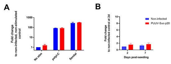 Effect of PUUV-Suo infection on interferon-stimulated Mx2 mRNA expression in Mygla.REC.B cells. (A) Non-infected or PUUV-Suo infected Mygla.REC.B cells (passage 20 post inoculation with wild PUUV) were either non-stimulated, stimulated with polyI:C or infected with Sendai virus for 24 h after 2 days post-seeding. RNA was isolated from cells and subjected to relative quantification of Mx2 mRNA using RT-qPCR using actin mRNA levels as reference. (B) Relative quantification of Mx2 mRNA in non-infected and PUUV-Suo infected Mygla.REC.B cells was performed from cells grown for 2 and 7 days post-seeding. Bars represent mean +/− standard deviation (n = 2).