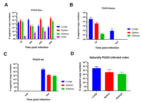 Following experimental infection of bank voles with PUUV-Suo or a mock inoculum (PBS), the amount of PUUV S segment RNA was measured in lungs, spleen, kidney and blood of voles at 3d, and 1, 2 and 5 wks pi. Viral RNA was measured in the urine of experimentally infected voles at 3d, and 1 and 2 wks pi. As another control, virus RNA load and RNA distribution in tissues were also assessed at 2 and 5 wks pi from voles inoculated with UV-inactivated PUUV-Suo isolate.
