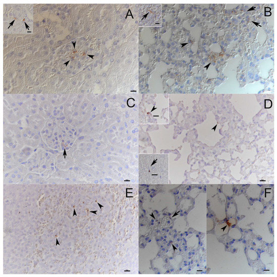 Both naturally and experimentally infected bank voles were examined by histology and immunohistology for PUUV N protein. The two naturally infected voles did not exhibit any histopathological changes and viral antigen expression was limited in its amount and distribution. Besides endothelial cells in renal glomerula and in some capillaries of the liver, kidney, lungs and heart (Figure 4A,B), pneumocytes (mainly type II) and macrophages in liver (Kupffer cells) and spleen (red pulp macrophages) were found to be occasionally positive (Figure 4B). In one animal with a higher number of positive cells, viral antigen was also detected in tubular epithelial cells in the renal cortex and medulla.