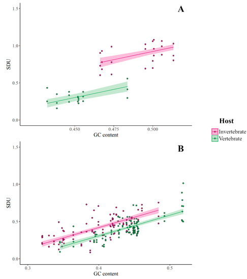 3.3. SDU Shows Consistent CpG Differences between Insect- and Vertebrate-Specific Viruses