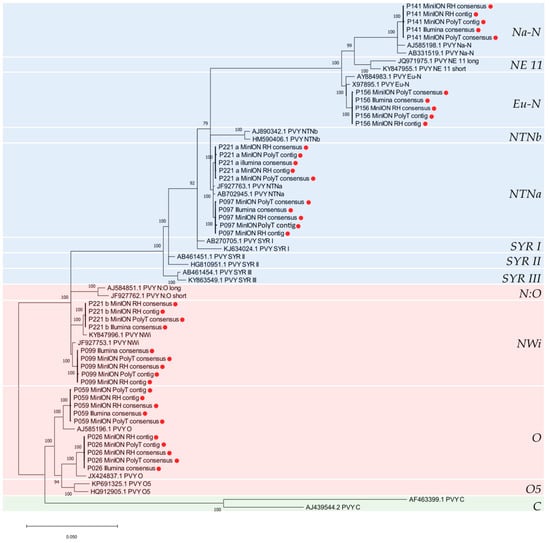 - Gibbs, A.J.; Ohshima, K.; Yasaka, R.; Mohammadi, M.; Gibbs, M.J.; Jones, R.A.C. The phylogenetics of the global population of potato virus Y and its necrogenic recombinants. Virus Evol. 2017, 3, vex002. [Google Scholar] [CrossRef]