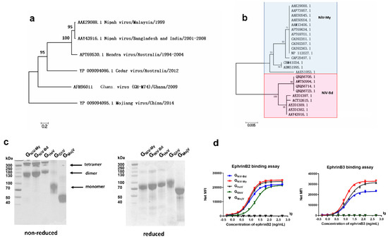 Phylogenetic analysis and expression of soluble G proteins. Molecular phylogenetic analysis of (a) henipaviruses-G glycoproteins (HNV-G) and (b) Nipah virus-glyco proteins (NiV-G). (c) GNiV-My (G protein of Malaysia Nipah virus), GNiV-Bd (G protein of Bangladesh Nipah virus), GHeV (G protein of Hendra virus), GGhV (G protein of Ghana virus), and GMojV (G protein of Mojiang virus) were expressed in the Expi293 suspension cells and purified by affinity chromatography. Purified proteins were assessed on non-reduced and reduced SDS-PAGE gel. (d) G proteins are coupled to luminex magnetic microspheres, and the binding between GNiV-My, GNiV-Bd, GHeV, GGhV, and GMojV and ephrinB2 or B3 receptors was then detected using the luminex xMAP multi-factor detection assay. The median fluorescence intensities (MFI) binding curves of the G proteins to receptors are shown. Each concentration contains two replicates, and each replicate is shown.