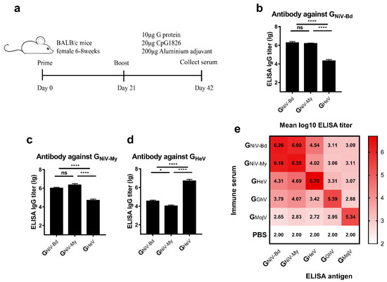 Cross-reactive specific antibody response induced by G proteins. (a) BALB/c mice (6–8 weeks, female, N = 10 per group) were immunized intramuscularly with 10 μg GNiV-My, GNiV-Bd, GHeV, GGhV, GMojV, or PBS at weeks 0 and 3. The adjuvants added were 200 μg of aluminum hydroxide and 20 μg of CpG1826. At 42 days after immunization, the mice were sacrificed, and the serum was collected. Specific antibodies against G proteins in the serum were detected by an enzyme-linked immunosorbent assay (ELISA). (b) Antibody titers against GNiV-Bd. (c) Antibody titers against GNiV-My. (d) Antibody titers against GHeV. The mean log10 ELISA titer ±SEM is shown. Student’s t test was performed for all comparisons, and a P-value < 0.05 was considered statistically significant; * 0.01< P-value < 0.05; **** P-value < 0.0001. (e) Matrix graph of the cross-reactive antibody responses elicited by the HNV-G proteins. The data are presented as the mean log10 ELISA titers. Same data is used in more than one panel.