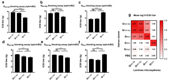 Cross-reactive neutralizing antibody response induced by G proteins. EphrinB2 competitive inhibition experiment against (a) GNiV-Bd, (b) GNiV-My, and (c) GHeV. EphrinB3 competitive inhibition experiment against (d) GNiV-Bd, (e) GNiV-My, and (f) GHeV. The data are presented as the mean log10 IC50 titer ±SEM. Student’s t test was performed for all comparisons, and a P-value < 0.05 was considered statistically significant; * 0.01< P-value < 0.05; ** 0.001< P-value < 0.01; *** 0.0001< P-value < 0.001; **** P-value < 0.0001. (g) Matrix graph of the EphrinB2 competitive inhibition experiment. The data are presented as the mean log10 IC50 titer. The same data is used in more than one panel.