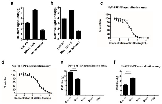 Packaging and verification of the NiV and HeV pseudoviruses. Codon-optimized, full-length G and F protein genes of NiV and HeV were inserted into the pcDNA3.1 vector to generate synthetic viral proteins. For the NiV-PP, the sequences of the G (Genebank protein ID: AAY43916.1) and F (AAY43915.1) proteins were used; for the HeV-PP, the sequences of the G (AEQ38071.1) and F (AEQ38070.1) proteins were used. By truncating the pcDNA3.1-NiV-F plasmid, 5 amino acids in the C-terminal intracellular region of the F protein were retained; the pseudovirus made by the truncated F plasmid was named NiV-T5F-PP. By truncating the pcDNA3.1-HeV-F plasmid, 5 amino acids in the C-terminal intracellular region of the F protein were retained; the pseudovirus made by the truncated F plasmid was named HeV-T5F-PP. (a) Effect of the truncation of the F proteins on the NiV pseudovirus titer. Each point represents three duplicates, and the error bar represents SEM. (b) Effect of the truncation of the F proteins on the HeV pseudovirus titer. (c) HeV pseudovirus-neutralizing experiment using M102.4. Each point represents three duplicates, and the error bar represents SEM. (d) NiV pseudovirus-neutralizing experiment using M102.4. (e) NiV pseudovirus-neutralizing experiment. (f) HeV pseudovirus-neutralizing experiment. The data are presented as the mean log10 IC50 ± SEM. Student’s t test was performed for all comparisons, and a P-value < 0.05 was considered statistically significant; **** P-value < 0.0001.
