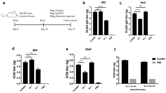 Specific pathogen-free BALB/c mice (6–8 weeks, female) were immunized intramuscularly with 10 μg GNiV-My, GNiV-Bd, GHeV, GGhV, GMojV, Fc2HNV, or Fc4HNV at weeks 0 and 3. The adjuvants added were 200 μg of aluminium hydroxide adjuvant (InvivoGen, San Diego, CA, USA) and 20 μg of CpG ODN 1826 (InvivoGen). The volume of inoculum per mouse was 100 μL. The mice were sacrificed 42 days following the first immunization, and the serum was collected. All of the animal experiments in this study were approved by the Laboratory Animal Care and Use Committee of the Beijing Institute of Biotechnology (approval number: IACUC of AMMS-08-2018-001, date of approval is 10 July, 2018). Mice were sacrificed at the indicated time by CO2 inhalation. All efforts were made to minimize suffering.