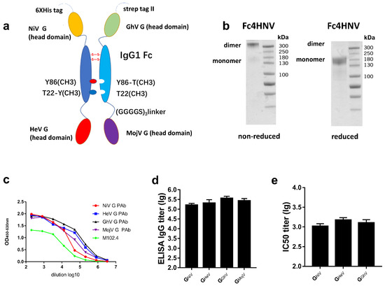 In the non-reduced SDS-PAGE experiments, Fc4HNV was almost entirely present as a dimer (Figure 7b). We then used ELISA to characterize the binding between the Fc4HNV proteins and mAb, M102.4, or pAb against the G proteins. Fc4HNV binded to M102.4 and pAb against GHeV, GNiV, GGhV, and GMojV (Figure 7c).