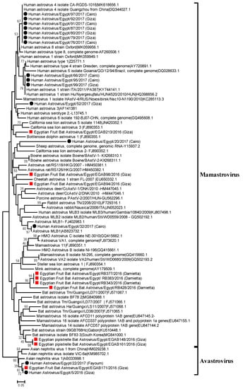 In conclusion, we have characterized astroviruses circulating in humans, bats, and wild birds in Egypt. The close phylogenetic relationship between some avian, bat, and human astroviruses implies the possibility of cross-species transmission among different hosts. Our findings suggest the need for systemic surveillance of different species of mammals and birds.