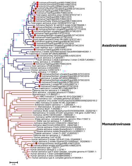 Neighbor joining phylogenetic tree of 342 bp of RNA-dependent RNA polymerase gene of the detected astroviruses in wild bird samples. Geographical sampling location was indicated in taxa of our Avastroviruses as MB-A: Aswan; MB-D: Damietta; MB-P: Port Said; and MB-F: Fayoum. Astroviruses sequenced specifically for this study are labeled with red circles. The percentage of replicate trees in which the associated taxa clustered together in the bootstrap test (1000 replicates) is shown at the dendrogram nodes. The phylogenetic analysis was performed by using MEGA version 7.
