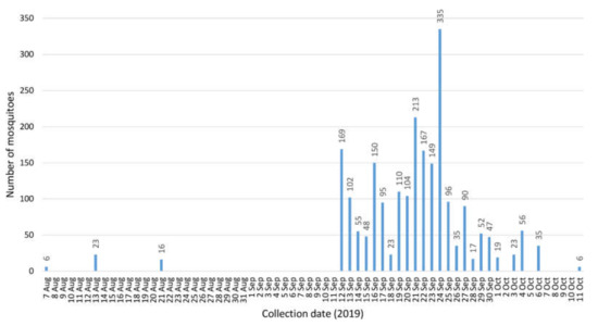 The positive mosquitoes were collected 13 August, and 12, 13 (2 pools), 17 and 24 (2 pools) September 2019 (Table 2). A first dead snowy owl had been found on 4 August 2019 and confirmed WNV-positive on 20 August 2019. In total, 33 dead birds had been collected in Berlin during 2019 [35], confirming the hot spot situation. In that year, the BG-Sentinel trap alone collected three times during its operation period before 12 September, and once after 6 October (Figure 1). After 11 October, no more mosquitoes were caught. Not surprisingly, when both the BG-Sentinel and the 20 EVS traps were continuously active, numbers of captured mosquitoes increased considerably. Thus, the majority of mosquito specimens were collected from 12 September to 6 October (Figure 1). Minimum infection rates (MIR) per 1000 and infection rated per maximum likelihood estimates were calculated using the Excel add-in of the Center for Disease Control and Prevention (https://www.cdc.gov/westnile/resourcepages/mosqSurvSoft.html). Only female mosquitoes of the Cx. pipiens complex were included in the calculation (Table 3). Overall MIR for the complete collection period was 3.29. On the positive days, it accounted to 50 (13 Aug), 6.85 (12 Sep), 21.05 (13 Sep), 11.49 (17 Sep) and 6.10 (24 Sep).