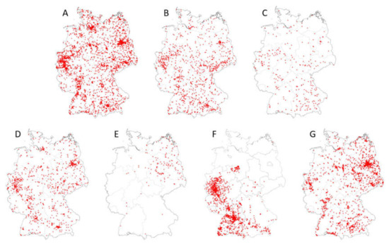 Distribution maps (presence data) of major potential WNV vectors in Germany (data extracted from CULBASE database, with collection dates from 2012 to 2018; red dots represent collections sites). (A) Cx. pipiens biotype pipiens, (B) Cx. pipiens biotype molestus, (C) Cx. pipiens biotype pipiens x Cx. pipiens biotype molestus hybrids, (D) Cx. torrentium, (E) Cx. modestus, (F) Ae. japonicus, (G) Ae. vexans. See [35] for areas of WNV detection in vertebrates in eastern Germany in 2018 and 2019.