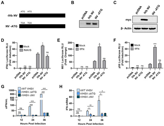 Previous studies demonstrated a role for VHSV IVb M protein in inhibition of IFN signaling. In contrast, VHSV IVb NV protein expression positively regulated IFN signaling [24]. To better examine the role of VHSV IVb NV on IFN signaling, we compared the effect of WT IVb NV to NV-ATG, in which the two ATG start codons of the IVb NV open reading frame were mutated to TGA codons (NV-ATG) on IFN-β promoter induction (Figure 1A–C). While WT IVb NV expression resulted in 25-fold increase in IFN-β promoter activity, NV-ATG did not alter IFN-β promoter activity, suggesting an impact of the IVb NV protein alone on IFN production (Figure 1D). We further determined the impact of IVb NV on interferon signaling and interferon-stimulated gene (ISG) expression by assessing MX1 promoter activity in luciferase assays. We observed a 3-fold increase in promoter activity with WT NV cotransfection as compared to the control plasmid or NV-ATG cotransfection (Figure 1E). A similar increase in p56 promoter activity was observed upon WT, but not NV-ATG cotransfection, suggesting a broad augmentation of innate immune signaling by the IVb NV protein (Figure 1F).