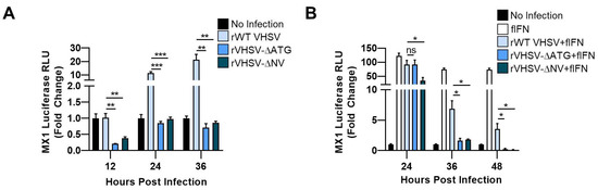 NV deficient VHSV inhibits IFN signaling. (A) EPC cells were transfected with MX1/luc for 24 h, followed by infection with the indicated virus for 12, 24, or 36 h. Luciferase assay values were quantified and normalized to non-infected. (B) EPC cells were transfected with MX1/luc for 24 h, followed by infection with the indicated virus for 24, 36, or 48 h. Infected cells were treated with EPC IFN and luciferase assay values were quantified 12 h later and normalized to non-infected. Error bars reflect SEM *, p < 0.05; **, p< 0.01; ***, p< 0.001.