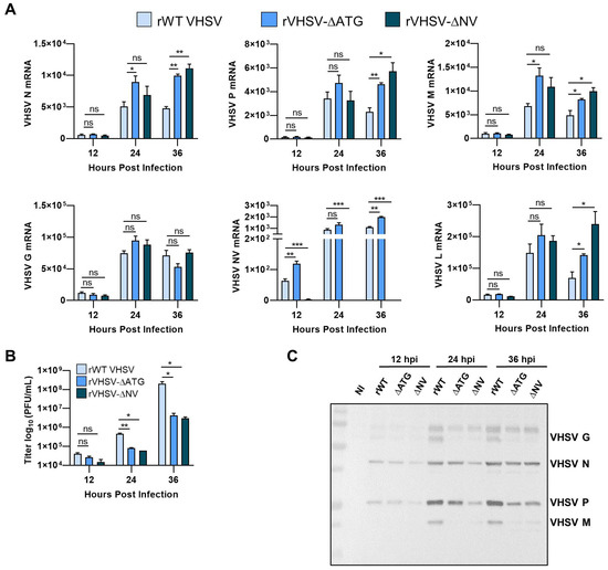 Removal of IVb NV from recombinant VHSV leads to decreased viral protein expression and a decrease in viral yield [18]. To assess the impact of IVb NV on viral-dependent transcription, RNA harvested at indicated times post infection was assessed for levels of viral mRNAs (Figure 3A). We observed a small but significant increase in levels of VHSV N, P, M, NV, and L mRNA during both VHSV-∆ATG and VHSV-∆NV viral infection compared to rWT VHSV IVb. There was no significant difference in levels of viral mRNA between the two NV mutant viruses. Unlike other viral mRNAs, we did not observe significant difference in levels of VHSV G mRNA. However, despite the slight increase in viral mRNA levels, we observed a log decrease in viral yield as well as decreased expression of viral proteins with IVb NV mutant VHSV infection (Figure 3B,C). The decrease in viral protein expression, despite the increase in viral mRNA levels, suggest that IVb NV may play a critical role in the synthesis of viral proteins.