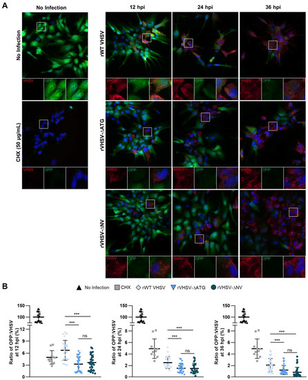 NV deficient VHSV inhibits translation. (A) EPC cells were infected with rWT VHSV, VHSV-∆ATG, and VHSV-∆NV for 12, 24, or 36 h at a MOI 1. At designated time points, levels of newly synthesized proteins in infected cells were visualized by Click-iT OPP Alexa Fluor 488 imaging and immunofluorescence analysis. Image magnification 60× (B) Quantification of (A). OPP fluorescence signal normalized to VHSV fluorescence and plotted as a percent ratio normalized to no infection. Error bars reflect SD *, p < 0.05; **, p < 0.01; ***, p < 0.001.