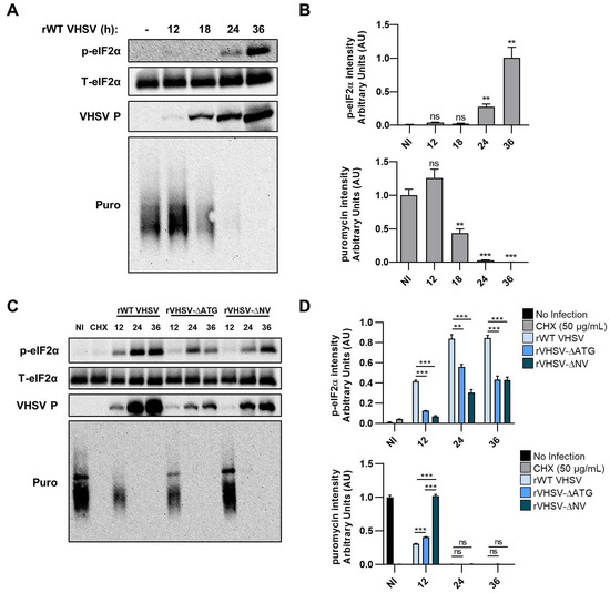 To better understand the impact of IVb NV protein on host translation, we compared phosphorylation of eIF2α in EPC cells infected with rWT VHSV IVb or VHSV IVb NV mutant viruses. Levels of p-eIF2α in IVb NV mutant virus infection were significantly lower at 12 hpi as compared to rWT VHSV (Figure 5C,D). Interestingly, the puromycin incorporation in IVb NV deleted VHSV infected EPC cells was comparable to uninfected cells, although the ΔATG mutant was similar to WT virus (Figure 5C,D). Interestingly, the puromycin incorporation in IVb NV-deleted VHSV was comparable to uninfected cells. However, at later times of infection, translational shutoff correlated with p-eIF2α in all three virus infections. Likewise, consistent with our previous observations (Figure 3C), we see a decrease in the accumulation of viral proteins in VHSV IVb NV mutant viruses compared to rWT VHSV IVb.