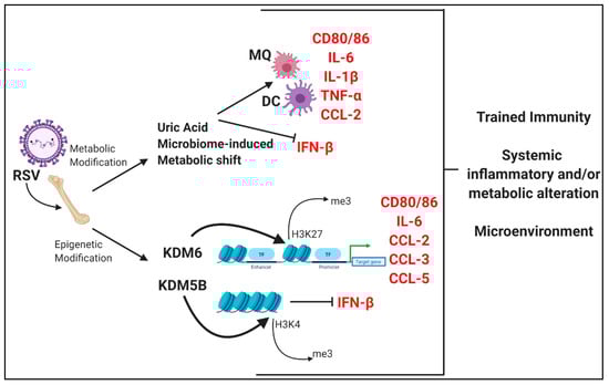 Trained immunity involves innate cells such as myeloid cells (including dendritic cells), natural killer (NK) cells, and innate lymphoid cells (ILCs) and their interactions with pattern recognition receptors (PRRs) and effector cytokines. In contrast to classical adaptive memory, the increased responsiveness to secondary stimuli during trained immunity is not specific for a particular pathogen and it is mediated through signals involving transcription factors, epigenetic reprogramming and metabolic alterations [79,80,81]. A distinguishing feature of trained innate immunity is the ability to mount a qualitatively different and often much stronger transcriptional response when challenged with pathogens or danger signals. In myeloid cells, many loci encoding inflammatory genes are in a repressed configuration [82,83]. Upon primary stimulation, massive changes are observed in these loci with alterations driven by the recruitment of transcription factors to enhancers and gene promoters [79]. Transcription factors then recruit coactivators that locally modify chromatin to make it more accessible to transcriptional machinery [82,83]. Maintenance of this enhanced accessibility may lead to more efficient induction of genes primed by the initial stimulation [84]. The persistence of histone modifications deposited at promoters or enhancers after the initial stimulus may impact the secondary response [79,85]. Therefore, the observed long-term persistence of some histone modifications in myeloid cells after removal of the initial activation stimulus may reflect either stability of these marks or the sustained activation of the upstream signaling pathways and transcription factors that control their deposition. It is reasonable to ascertain that the innate immune system, specifically myeloid populations such as macrophages and DCs, may be persistently “trained” following an early-life RSV infection that leads to an inappropriate response to unrelated exposures, such as those observed following a future allergen challenge.