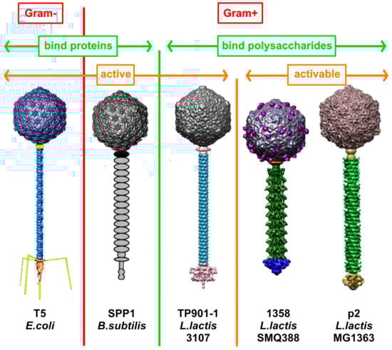 Examples of siphophages infecting Gram-positive and Gram-negative bacteria. Phages are classified between those binding to host-encoded proteins (green, left) or cell wall polysaccharides (green, right) and those with a ready to bind adhesion device (orange, left) and those with an activable adhesion device (orange right).