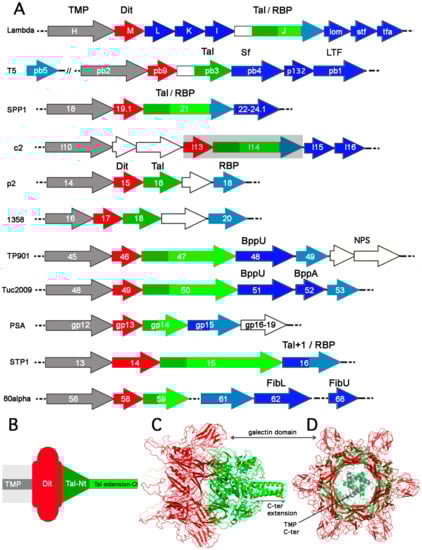 The adhesion device of siphophages. (A) Schematic representation of genes coding for the adhesion device of representative phages: lambda [], T5 [], SPP1 [], c2 [], p2 [], 1358 [], TP901-1 [,], Tuc2009 [], PSA [], STP1 [], 80α []. Tape measure proteins (TMPs) are color-coded grey; distal tail proteins (Dits) are color-coded red; tail-associated lysozymes (Tals) are color-coded dark green (Nt-structural domain), light green (Tal extension), light blue for Tal extension tip bearing a receptor-binding domain; receptor-binding proteins (RBPs) are color-coded light blue; ancillary proteins and tail fibers are color-coded dark blue. White genes are non-structural. The c2 phage Dit and Tal are shaded grey as their annotation is highly hypothetic; (B) Schematic topology of the TMP-Dit-Tal triad (same color code as in (A)); (C) Example of a TMP-Dit-Tal triad from phage 80α baseplate [] (same color code as in (A) and (B). The TMP is dark grey); (D) 90° rotation with respect to C.