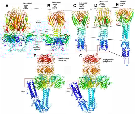 X-ray structures of RBPs from siphophages binding to host cell wall saccharidic receptors. (A) Lactococcal phage 1358 []; (B) Lactococcal phage p2 []; (C) Lactococcal phage TP901-1 []; (D) Lactococcal phage Tuc2009 []; (E) Receptor-binding domain and stem of listerial phage PSA []; (F) Staphylococcal phage 80α []; (G) Staphylococcal phage ϕ11 []. The various domains are identified: shoulders and stem, binding to the rest of the baseplate, the neck joining the shoulders/stem to the head. The head bearing the receptor-binding crevice. The stem N-terminus, involved in baseplate integration of the RBP, has been boxed in red.