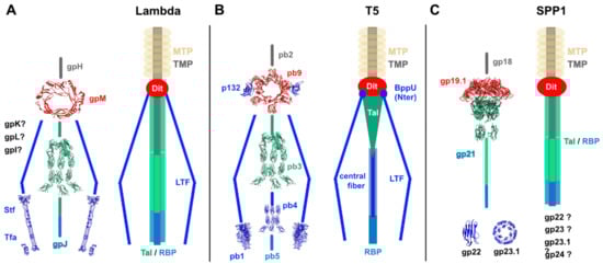 Architecture of the phage lambda, T5, and SPP1 host adhesion devices targeting membrane proteins. (A) Right. The lambda host adhesion device is formed by the Dit hexameric ring (gpM) and the long trimeric Tal / RBP (gpJ) central fiber. The positions of gpK, gpL, and gpI proteins in the lambda tail spike are not known. Ur-lambda also contains long tail fibers (LTFs) (Stf and Tfa). Left. Structural models, based on HHpred analyses, of gpM, gpJ middle domains (residues 326-449 and 570-811), Stf C-terminal domains (residues 578-774), and Tfa (residues 62-192). The Dit ring is a tilted view. The crystal structures used to produce these representations are PDB ID 4JMQ [] for gpM, PDB IDs 3D37, and 5UTK for gpJ, PDB ID 2XGF for Stf [], and PDB ID 5YVQ for Tfa []. (B) Right. The T5 host adhesion device is formed by the Dit hexameric ring (pb9), the trimeric Tal (pb3), and central fiber (pb4), and the RBP (pb5). LTFs (pb1) are anchored to the Dit ring via p132. Left. Ribbon representations of the pb9 (PDB ID 4JMQ) and pb1 (PDB ID 4UW8) [] crystal structures. The Dit ring is a tilted view. Structural models, based on HHpred analyses, of pb3 (residues 528-709 and 735-849), pb4 (residues 6-319), and p132. The crystal structures used to produce these representations are PDB IDs 3D37 and 5UTK for pb3, PDB ID 5UTK for pb4, and PDB ID 3UH8 [] for p132. (C) Right. The SPP1 host adhesion device is formed by the Dit hexameric ring (gp19.1) and the long trimeric Tal / RBP (gp21). The positions of gp22, gp23, gp23.1, and gp24 proteins in the SPP1 tail spike are not known. Left. Ribbon representations of the gp19.1 (PDB ID 2X8K), gp22 (PDB ID 2XC8), and gp23.1 (PDB ID 2XF7) crystal structures [,]. Structural models, based on HHpred analyses, of the gp21 N-terminal domains (residues 3-404 and 422-518). The crystal structure used to produce these representations are PDB IDs 3GS9 and 5E53 [].