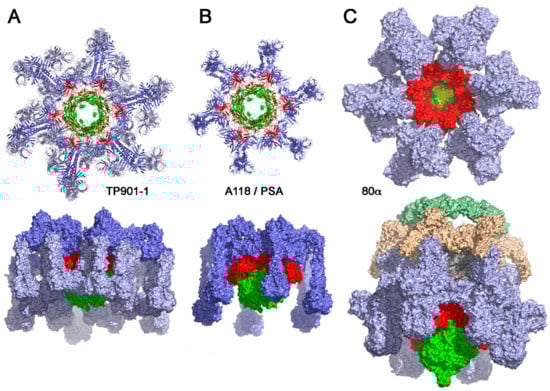 - Veesler, D.; Cambillau, C. A common evolutionary origin for tailed-bacteriophage functional modules and bacterial machineries. MMBR 2011, 75, 423–433, first page of table of contents. [Google Scholar] [CrossRef]