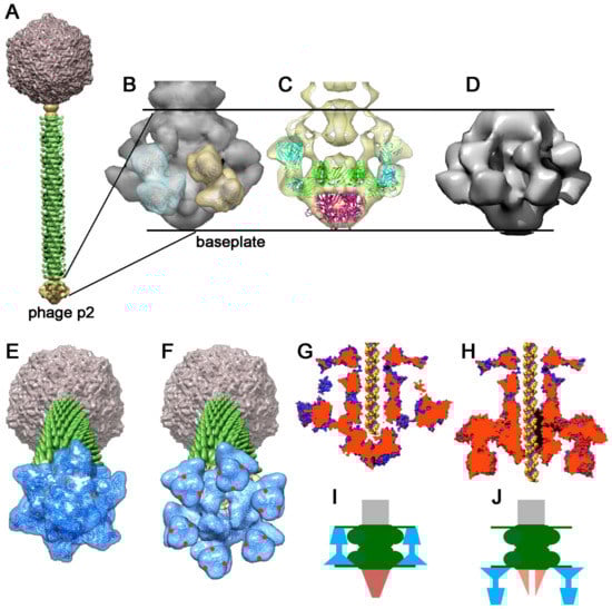 Structure of the activatable baseplates from siphophage p2. (A) negative staining EM (nsEM) structure of the phage p2 virion []. (B) Zoom on the baseplate with two RBPs fitted in the nsEM map. (C) Slicing of the nsEM map exhibiting the baseplate (Dits, Tals, and RBPs) fitted inside. (D) nsEM structure of the expressed baseplate; note the extra volume compared to the X-ray structure obtained in the presence of VHHs []. (E) Representation of phage p2 with the non-activated baseplate. (F) Representation of phage p2 with the X-ray determined activated baseplate localized at the tail extremity. The red arrows show the open Tal channel and the red dots the position of the receptor binding crevices. (G,H) sliced views of the structures shown in (E)- and (F)-, respectively. A model of dsDNA helix shown in the central closed or open channel. (I,J) schematic representation of the phenomenon associated with baseplate activation.