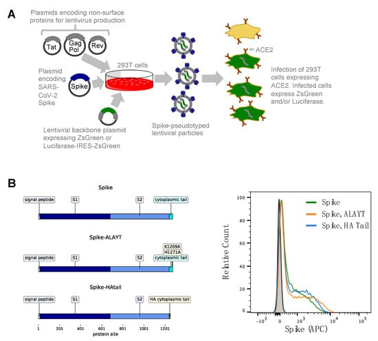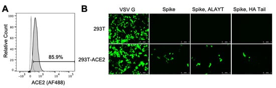 The basic strategy for pseudotyping HIV-1-derived lentiviral particles is shown in Figure 1A. It involves transfecting 293T cells with a lentiviral backbone plasmid encoding a fluorescent or luminescent reporter protein, a plasmid expressing Spike, and plasmids expressing the minimal set of lentiviral proteins necessary to assemble viral particles. The transfected cells then produce Spike-pseudotyped lentiviral particles that can be used to infect permissive cells that express the SARS-CoV-2 receptor protein, ACE2 [,,,].