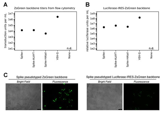Titers of Spike-pseudotyped lentiviral particles in 293T-ACE2 cells. (A) Titers of the ZsGreen backbone pseudotyped with the three Spike variants or VSV G, as determined by counting green cells via flow cytometry analysis at 48 h post-infection and then calculating transduction-competent viral particles per mL from the percentage of green cells. The “n.d.” indicates that the titer was not detectable. Data shown are from a single representative example. (B) Titers of the Luciferase-IRES-ZsGreen backbone as determined by measuring relative luciferase units (RLUs). RLUs were determined at 48 h after infecting ~2.3 × 104 293T-ACE2 cells per well in 96-well plates. The RLUs per mL for the Spike-pseudotyped viruses are the average of three three-fold serial dilutions of virus starting at 50 μL virus in a total volume of 150 μL. For the VSV G-pseudotyped virus, RLUs per mL were averaged from two three-fold dilutions starting at 3 μL virus in a total volume of 150 μL. (C) Microscope images showing 293T-ACE2 cells transduced with Spike pseudotyped virus with either the ZsGreen or Luciferase-IRES-ZsGreen backbone at 60 h post-infection. As can be seen from the images, the ZsGreen backbone gave a stronger fluorescent signal than the Luciferase-IRES-ZsGreen backbone, presumably because this protein was expressed more strongly as the sole CMV-promoter driven transcript than as the second transcript driven by an IRES.