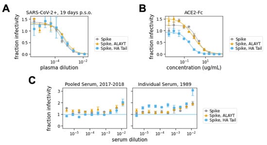 Neutralization assays. (A) Neutralization assay using plasma collected from a confirmed SARS-CoV-2-infected patient at 19 days post-symptom onset (“p.s.o.”). The IC50 for this plasma was 1:2076 for the Spike-pseudotype, 1:1334 for the Spike-ALAYT-pseudotype, and 1:1605 for the Spike, HAtail-pseudotype. (B) Neutralization assay using soluble ACE2 protein fused to the Fc domain from IgG (ACE2-Fc). The IC50 for ACE2-Fc was 2.49 μg/mL for the Spike-psdeudotype, 1.75 μg/mL for the Spike-ALAYT-pseudotype, and 0.25 μg/mL for the Spike-HAtail pseudotype. (C) Negative control sera collected prior to the emergence of SARS-CoV-2 did not neutralize the Spike-pseudotyped lentiviral particles. The serum from 1989 was from a person of a similar age at the time of serum collection as the confirmed SARS-CoV-2 infected patient whose plasma was tested in A. High concentrations of naïve serum seemed to enhance luciferase signal, perhaps because of components that improve cell-growth. Each point shows the average of duplicate values with error bars showing standard error.