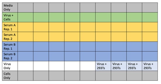 Example plate layout for neutralization assays. It is possible to run full-dilution series of two sera or plasma samples in duplicate on each plate with the necessary controls. These controls include media only, cells only, and virus-only wells, as well as four wells of virus-infecting 293T cells to confirm the lack of infection with Spike-pseudotyped lentivirus in the absence of ACE2. The average signal from the “Virus Only” and “Virus + 293Ts” wells provides the background signal. The “Virus + Cells” wells represent maximum infection without any serum and provide a metric for 100% virus infectivity. Note that “cells” here refers to the 293T-ACE2 cells. The different colors simply denote different conditions, such as different serum samples or cells. These conditions are labeled in the left-most column of the figure (or in each individual cell for the “Virus + 293Ts” condition).