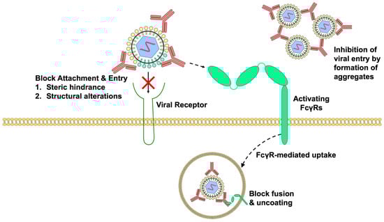 Antibodies can neutralize LAV strains in a variety of ways, as summarized in Figure 1. They may block virus attachment and entry by either binding to epitopes that are directly involved in virus–receptor interactions or by imposing steric hindrance that prevent virus interaction with host receptors. As most virus structures are dynamic and can change structural conformations at different temperatures, it is thought that antibody binding to these dynamic structures may cause structural changes that can impair virus attachment, thereby causing virus neutralization []. However, the blockade of virus–receptor interactions alone may not be able to completely neutralize the viruses, especially in FcγR-bearing cells, as activating FcγRs can enable entry of virus–antibody complexes by FcγR-mediated uptake. Thus, pre-existing antibodies that can block viral fusion and uncoating will likely be more efficient in virus neutralization. In situations where pre-existing cross-reactive antibodies are unable to inhibit viral fusion processes intracellularly, high concentrations of antibodies may enable the formation of viral immune aggregates that influence the types of FcγRs engaged. These large viral aggregates can then inhibit phagocytosis by co-ligating the lowly expressed inhibitory receptor FcγRIIB that inhibit phagocytosis [,]. Finally, there have been theories suggesting that FcγR cross-linking by virus immune complexes may increase the production of IL-10 that abolishes innate immune responses []. However, more experimental evidence will be required to support this theory.