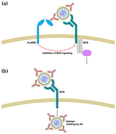 Effects of antibody binding on B-cell activation. (a) Formation of viral immune complexes may result in cross-linking and activation of the inhibitory FcγRIIB, which in turn inhibits downstream BCR signaling. (b) Antibody binding may prevent the exposure of epitopes normally recognized by B-cells in a phenomenon known as “epitope masking”, thereby preventing B-cell activation.