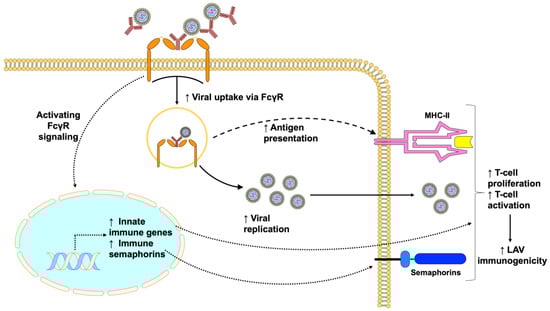 Pre-existing antibodies can improve vaccine immunogenicity by promoting virus infection and inducing innate and adaptive immune responses. Immune complexes formed by pre-existing antibodies and viruses can engage FcγRs, resulting in increased viral uptake and fusion through the process of antibody-dependent enhancement that leads to increased vaccine viremia and antigen presentation. Activating FcγR-signaling, on the other hand, provokes greater innate immune responses and production of pro-inflammatory metabolites that can enhance innate and adaptive immune responses. In addition, the cross-linking of FcγRs causes increased expression of immune semaphorins, which are critical for antigen-presenting cell and T-cell interaction. Overall, this leads to increased T-cell proliferation and activation, which consequently improves LAV immunogenicity.