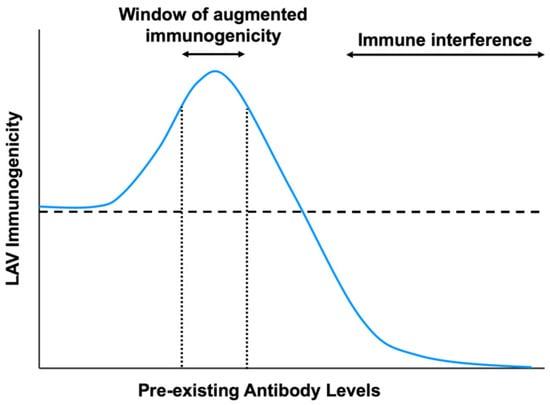 The impact of pre-existing antibody levels on live-attenuated vaccine immunogenicity. In the presence of high levels of pre-existing antibodies or with potently neutralizing antibodies, LAV immunogenicity is hindered due to immune interference from virus neutralization or inhibition of B-cell responses. However, at sub-neutralizing antibody titers, there is a window of augmented vaccine immunogenicity due to increased uptake into Fc receptor-bearing cells and greater induction of innate immune responses. The horizontal dotted line indicates LAV immunogenicity in the absence of pre-existing antibodies.